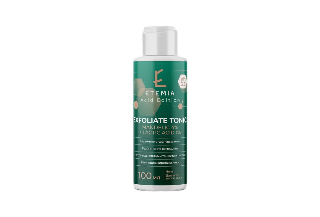 - Миндальная кислота (5%) + Молочная кислота (1%) разрушают связи между отдельными чешуйками и тем самым способствуют более быстрому обновлению кожи, придают ей мягкость, приятную гладкость и ровный тон, борются с симптомами гиперкератоза (утолщениям рогового слоя), устраняют сильные шелушения, грубые бляшки и шершавости, оказывают комедонолитическое действие путём отшелушивания эпителия в области устьев сальных желез и растворения черных точек, эффективно очищают и стягивают расширенные поры, помогают регулировать выработку кожного сала и, в свою очередь, уменьшают возникновение воспалений, подавляют процесс синтеза пигмента меланина и поэтому обладают хорошими отбеливающими свойствами, устраняя поверхностную пигментацию и следы от акне, усиливают барьерные свойства дермы, увеличивают синтез коллагена и гиалуроновой кислоты, борются с постоянной сухостью, низким тонусом и потерей эластичности.