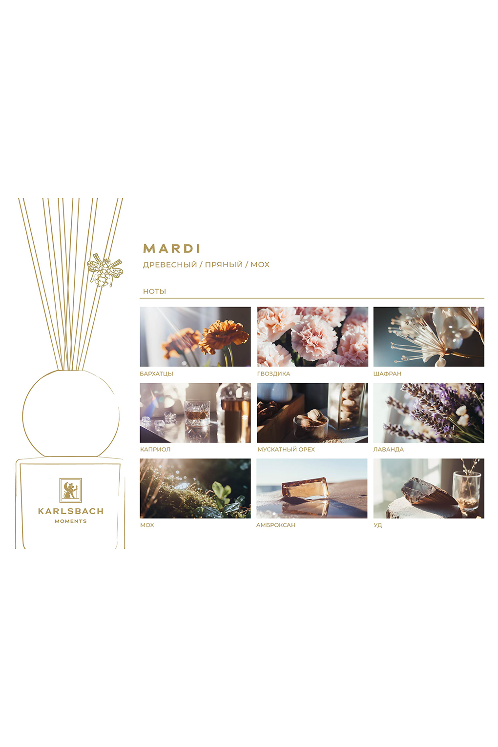 Компания KARLSBACH – первая в индустрии, которая интегрировала настоящую нишевую парфюмерию в ароматы для интерьера, переделав состав, но оставив композиции настоящих духов. Для создания коллекции диффузоров были использованы исключительно натуральные ингредиенты – французское масло и био компоненты, не вызывающие аллергических реакций.